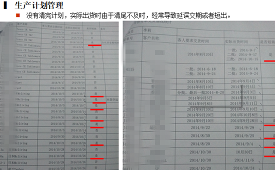 多数工厂没有专业的生控人员,甚至没有生控(PMC)职能部门,也就不用提标准交期和产销协调了,更不用说物料需求计划与现场生产计划,业务回复客户的货期多数都是依赖现场管理人员,现场管理人员说什么时候出货那就是什么时候出货,根本无法判断交期的合理性,出于本位主义,多数管理人员都给自己留了不少空间(记得有一个包装主管,订单出货本来正常情况就可以完成的,他却说很困难,需要努力一下就可以完成的,他会说完不成);订单尾数太多,甚至频繁出现从成型、上釉、窑炉、贴花到烤花,整个制程中各部门所生产的陶瓷不配套情况,车间现场在制品积压严重,生产数据不准,仓库数据不准又或者根本没有管理仓库数据.....
