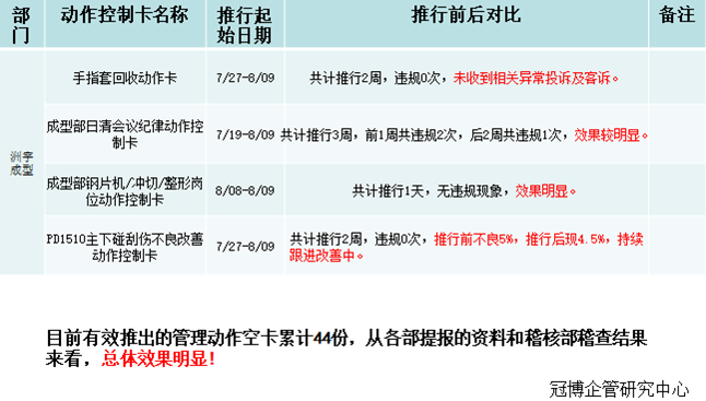 冠博企管的所有项目均导入了三要素控制卡,它是快速完善现有管理系统实现精细化管理的重要工具,同时也是提升管理队伍综合管理能力的重要工具,管理效果立竿见影,用过的企业无一不说效果好!